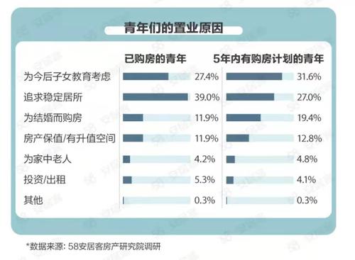 25-29岁青年置业主因结婚所需,其次为追求稳定居所,也有21.6%的人会考虑子女教育问题,而老人、出租、无极集团总代理 升值与他们都存在一定的距离。30-34岁青年在子女教育方面的考虑明显增多,40.7%的人购房即为子女教育,12.6%的人考虑房产保值升值空间,这一占比超过25-29岁青年。