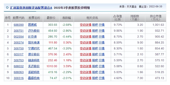 探长读财注意到,截至二季度末,“汇添富优选回报混合”的前十大重仓股基本以新能源股票为主,分别是固德威(9.73%)、迈为股份(9.06%)、比亚迪(8.75%)、阳光电源(8.59%)、宁德时代(8.30%)、德业股份(5.71%)、锦浪科技(5.59%)、禾迈股份(5.08%)、派能科技(5.03%)、晶盛机电(4.60%)。