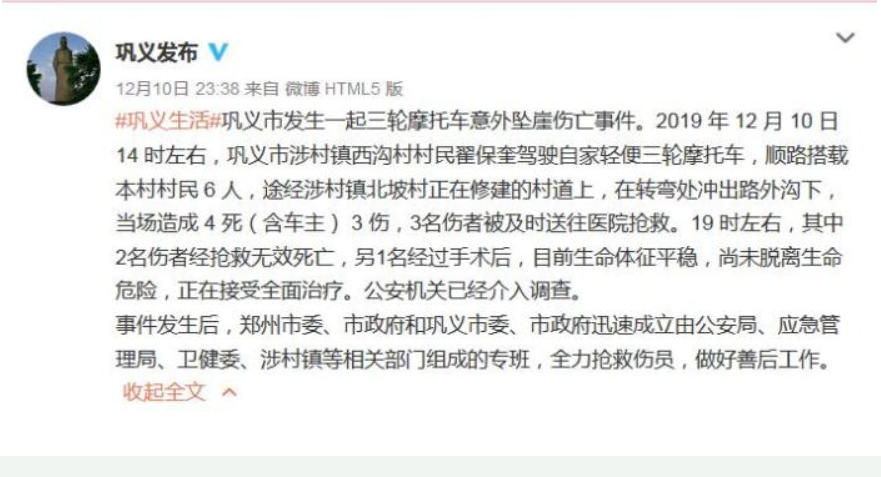 无极4平台代理河南巩义发生三轮摩托车意外坠崖