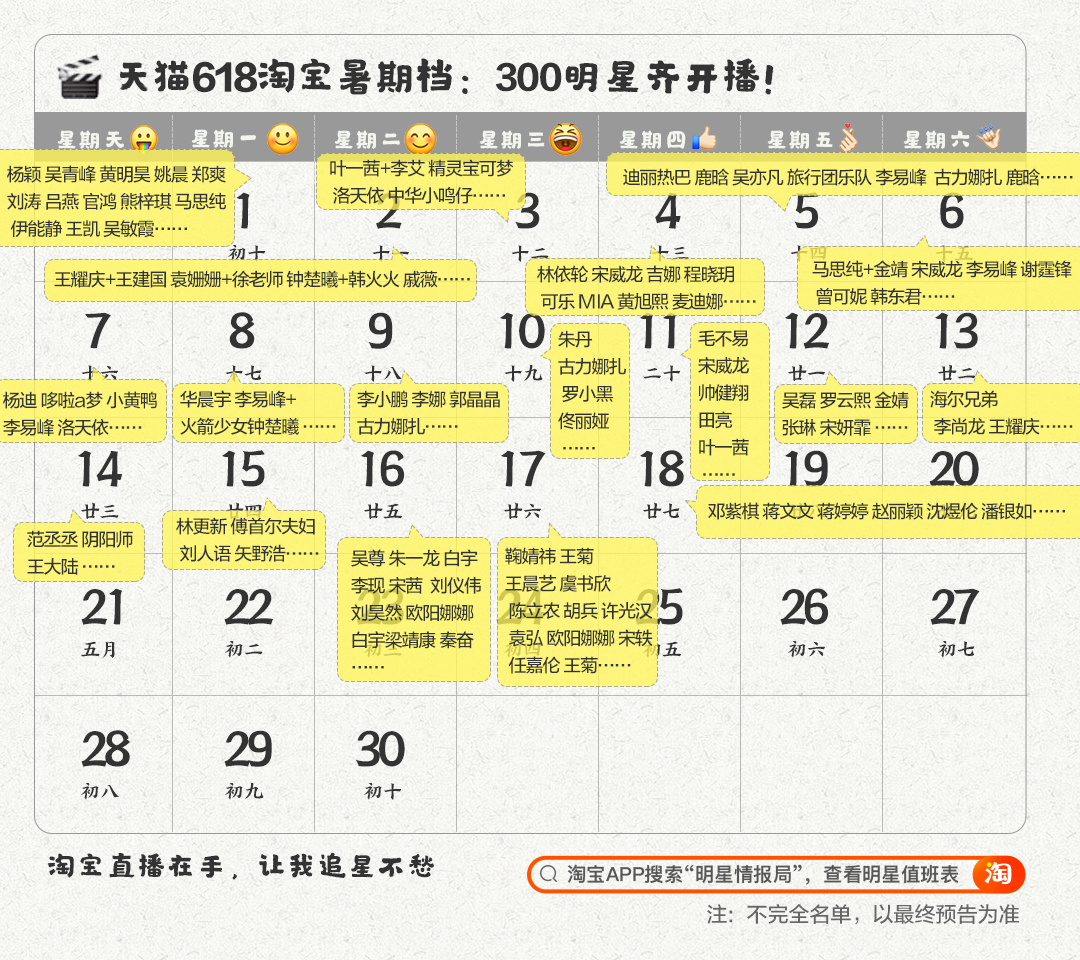 5月27日,无极4荣耀主管帐号天猫618首批明星直播名单公布:300多明星集体上淘宝直播,将掀起史上最大规模的明星开播潮。